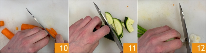 Schil en verwijder de uiteinden van de wortels, halveer ze in de lengte en snijd ze in schuine plakjes van ongeveer 3-4 mm dik 10. Doe hetzelfde met de courgettes 11. Snijd tenslotte de lente-ui in plakjes 12.
