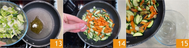 Verhit een scheutje olie in een anti-aanbakpan, voeg dan de groenten toe 13 en roerbak ze op hoog vuur een paar minuten, iets zoutend 14. Wanneer ze gebruind maar nog knapperig zijn, zet je ze apart 15.