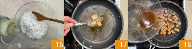 Ondertussen is de rijst gaar: giet hem af in een kom en breng op smaak met een scheutje olie 16. Haal de tofu uit de marinade en doe hem in dezelfde pan waarin je de groenten hebt gebakken 17, bak hem een paar minuten op hoog vuur totdat hij mooi geroosterd is. Giet nu ook het marinadesap erbij 18 en een scheutje water, roer goed en zet het vuur uit.