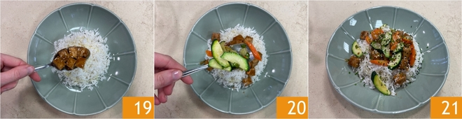 Je bent klaar om op te dienen: leg de rijst als basis, voeg vervolgens de tofu met zijn sausje toe 19 en de groenten 20. Maak af met zwarte en witte sesamzaadjes en fijngehakte bieslook. Je basmatirijst met tofu in sojasaus en gewokte groenten is klaar om van te genieten 21!