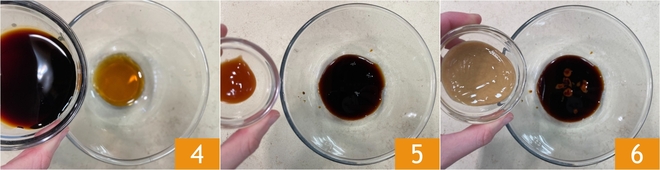 Voeg de sojasaus 4, de sriracha 5 en de pindakaas 6 toe.