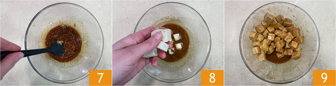 Meng het mengsel goed 7, voeg dan de tofublokjes toe 8 en meng met je handen zodat ze gelijkmatig bedekt worden 9. Laat ze marineren terwijl je verdergaat met de rest van het recept.