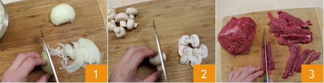 Om rundvlees Stroganoff te bereiden, snijd eerst de ui zeer fijn 1; maak daarna de champignons goed schoon en snijd ze in plakjes 2; snijd tot slot de rundvleesdelen in reepjes van ongeveer 5 cm lengte 3.
