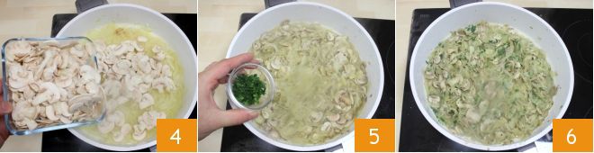 In een ruime antiaanbakpan laat u de ui 10 minuten zachtjes fruiten met 25 g boter, afgenomen van de totale hoeveelheid: de ui moet glazig worden en als hij te droog wordt, voeg dan een paar eetlepels water toe. Voeg vervolgens de champignons toe in de pan 4 samen met een paar eetlepels peterselie 5 en zet de bereiding nog eens 10 minuten voort 6; breng daarna op smaak met zout en peper.