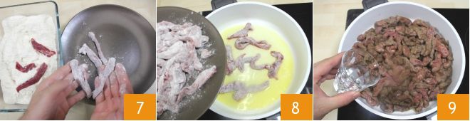 Bestrooi intussen de reepjes vlees met bloem 7 en bak ze in een andere pan 8 op hoog vuur met een scheutje olie en de resterende 25 g boter; zodra ze beginnen te kleuren, blus dan af met de vodka 9 en ga door met bakken. Breng het vlees op smaak met zout en peper.