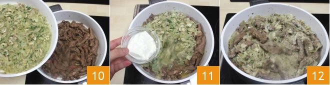Voeg de champignons en uien bij het vlees 10 en tenslotte de zure room 11 en de tomatenpassata. Laat nog een paar minuten koken en schep met een lepel alles goed door elkaar totdat de zure room gelijkmatig is opgenomen 12. Rundvlees Stroganoff is klaar om geserveerd te worden!