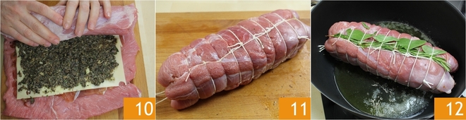 Rol het vlees op 10 en bind de rollade vast met keukentouw 11, alsof het een braadstuk is, volgens de instructies die je Hoe bind je een gebraad vindt. Steek salieblaadjes en rozemarijn onder het touw langs de hele lengte van de rollade en leg hem in een pan met hoge rand, waarin je 4 eetlepels olie hebt verhit, en bak hem rondom om alle uiteinden goed te sluiten 12.