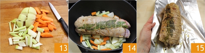 Snijd de ui, de selderij en de wortel in grove stukken 13 en voeg ze in de pan bij de rollade 14. Bestrooi het vlees met zout en peper en laat het 40 minuten garen met een deksel waar je een kleine opening in laat. Tijdens het garen begiet je de rollade met bier 15 telkens wanneer hij te droog dreigt te worden. Na 40 minuten controleer je of het vlees gaar is met een satéprikker: prik in het oppervlak van de rollade; er moet een helder sap uitkomen. Als het sap roze is, moet het vlees nog wat langer garen.