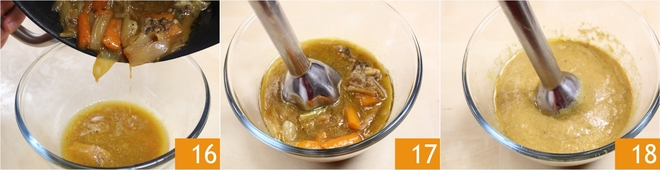 Als de bereiding klaar is, leg je de rollade op een vel aluminiumfolie 16 en vouw je het dicht, zodat de vleessappen zich kunnen herverdelen. Verplaats intussen het braadvocht met de groenten naar een kom en pureer het met een staafmixer 17 tot een smakelijk sausje dat het vlees begeleidt 18. Snijd het vlees in plakjes van een halve cm dik, schenk de saus erover en serveer je bierrollade met spek en paddenstoelen!