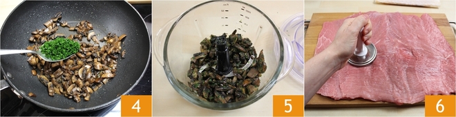 Voeg tenslotte een eetlepel fijngehakte peterselie toe 4, zout en peper en laat nog 3–4 minuten koken. Doe alles in een mixer 5 en pureer tot een grove crème, niet te fijn. Leg het kalfsvlees op een werkvlak en sla het plat met een vleeshamer 6.