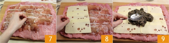 Nu begin je met vullen: bedek eerst met de plakjes spek 7, vervolgens met de plakjes Emmentaler 8 en tot slot bestrijk je met de warme paddenstoelencrème 9.