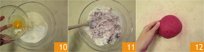 Voeg tenslotte het ei toe 10. Kneed het deeg ongeveer 5 minuten, voeg geleidelijk de resterende bloem toe 11 en vorm vervolgens een deegbal 12.