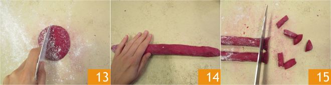 Verdeel de deegbal in tweeën 13, vorm er rolletjes van 14 en snijd met een scherp mes stukjes van ongeveer 2 cm 15.