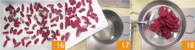 Leg ze op een met bloem bestoven schaal en zet een pan met water op het vuur om te verwarmen. Zodra het water kookt, zout je het en kook je de gnocchi 17. Zodra ze boven komen drijven, schep je ze in een kom 18.