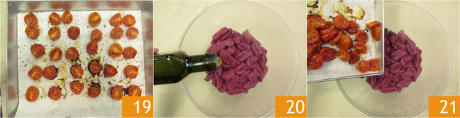 Intussen zijn de confit-tomaatjes klaar 19. Breng de gnocchi op smaak met olie 20 en voeg de confit-cherrytomaatjes toe 21.