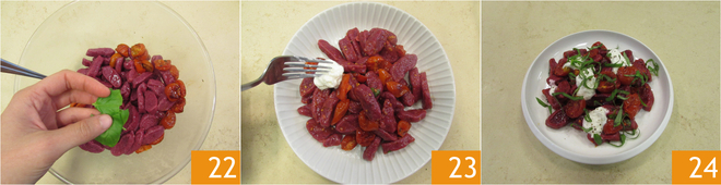 Breng op smaak met verse basilicum 22 en zout. Voeg tenslotte de stracciatella toe en serveer de bietengnocchi met cherrytomaatjes en stracciatella goed heet 24.