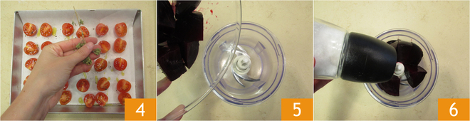 Bestrooi met oregano 4 en bak in een voorverwarmde oven zonder hetelucht ongeveer 1 uur op 160°. Doe de voorgekookte bieten in een mixer 5 en breng op smaak met zout 6.