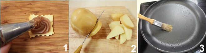 Om de bladerdeegjes met kastanjecr eme en gerookte scamorza te maken, begin je door elk flapje royaal te besmeren met een theelepel kastanjecr eme (als je wilt kun je een spuitzak met een gekartelde tuit gebruiken) 1.