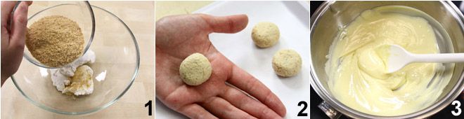 Om de bebloede oogjes te maken, begin je in een kom de ricotta te mengen met de fijngehakte biscotti 1. Voeg 50 g witte chocolade toe die je au bain-marie (of in de magnetron) hebt gesmolten en iets hebt laten afkoelen. Roer krachtig met een houten lepel om alle ingrediënten goed te mengen. Vorm van dit mengsel bolletjes van ongeveer 3 cm diameter, licht platgedrukt 2, en leg ze op een schaal of bakblik bedekt met bakpapier. Zet ze 15 minuten in de vriezer zodat ze opstijven en harder worden. Smelt ondertussen de resterende witte chocolade au bain-marie 3 (of in de magnetron) totdat deze vloeibaar genoeg is om als overtrek te gebruiken.