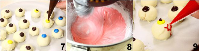 Met gesmolten pure chocolade maak je de pupil bovenop elke chocoladeconfetti met behulp van een spuitzak of een tandenstoker 7. Maak vervolgens de rode royal icing om de adertjes van het oog te creëren: klop het eiwit in een mixer tot het mooi wit en schuimig is, voeg dan de gezeefde poedersuiker toe en tenslotte zoveel rode kleurstof als nodig is om een mooie dieprode kleur te krijgen 8. Doe de icing in een spuitzak waarvan je de punt hebt afgesneden zodat er een heel klein gaatje ontstaat en teken daarmee de rode adertjes rondom het oog, beginnend bij de rand van het oog en teken onregelmatige adertjes naar de pupil 9.