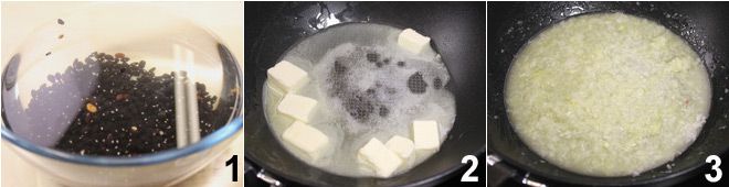 Om de bonencr me te maken, week je de bonen in ruim koud water gedurende 12 uur (het is beter als je ze de avond ervoor laat weken en ze de hele nacht in het water laat) 1. Na het weken spoel je de bonen af en laat je ze uitlekken. Ga verder met de bereiding van onze bonencr me: maak de ui en knoflook schoon en pel ze, hak ze fijn en fruit ze in een pan met de gesmolten boter 2 3;