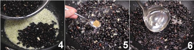 Voeg de bonen toe 4, het snufje komijn en koriander 5, dek af met warm water 6 en laat ongeveer een uur zachtjes koken totdat de bonen zacht zijn geworden; breng daarna op smaak met zout en peper.