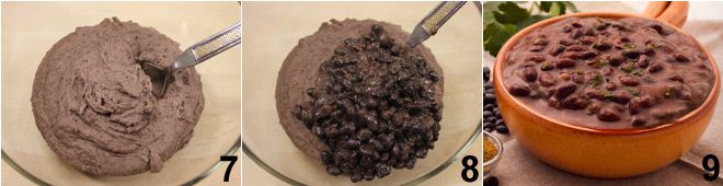 Neem 3/4 van de bonen, druk ze met een vork fijn of pureer ze 7; meng vervolgens de bonenpuree met de hele bonen 8; en verdeel de verkregen bonencr me over 4 individuele kommetjes die je warm hebt gehouden 9.