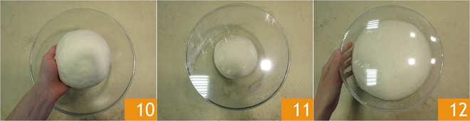 Leg het in een kom die je vooraf met olie hebt ingevet 10, dek af met plasticfolie 11 en laat het minstens 12 uur rijzen bij een temperatuur van 21-23° 12.