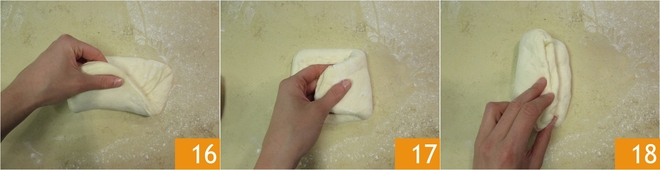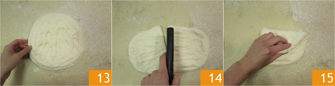 Na de rijstijd leg je het deeg op een licht bebloemd werkblad, maak het iets plat 13 en verdeel het in twee delen 14. Pak het eerste stuk en vouw de bovenste rand naar het midden 15.