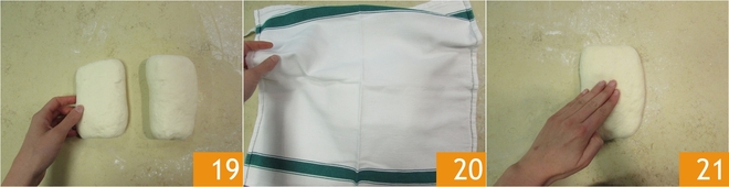 Doe hetzelfde voor het tweede bolletje 19, dek af met een doek 20 en laat 30 minuten rusten. Geef elk bolletje vier vouwen en laat ze afgedekt met een doek ongeveer 30 minuten rusten. Na de rusttijd pak je een van de bolletjes en druk je het lichtjes plat met je handen 21.