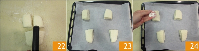 Snijd het in vier gelijke stukken en leg de broodjes op een bakplaat bekleed met bakpapier, met voldoende tussenruimte. Laat ze een uur rijzen 23, bestrooi ze daarna licht met wat bloem 23.