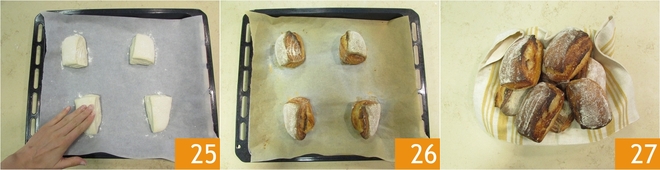 Veeg vervolgens voorzichtig het overtollige meel weg door er met je hand over te strijken 24. Bak de broodjes met zuurdesem in een voorverwarmde oven op 240° door onderin de oven een klein bakblik met water te plaatsen. Bak ze ongeveer 40 minuten, haal ze dan uit de oven 26 en laat ze afkoelen voordat je ze serveert 27.