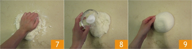Wanneer het water is opgenomen, verplaats je het deeg op het werkblad en blijf je kneden 7 totdat je een homogeen en elastisch deeg hebt. Voeg nu het zout toe 8 en kneed krachtig verder gedurende minstens 10 minuten, totdat het deeg glad is 9.