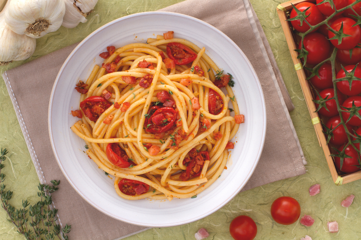 Bucatini met confit-cherrytomaatjes en blokjes pancetta