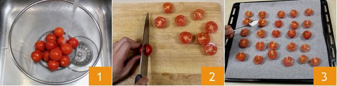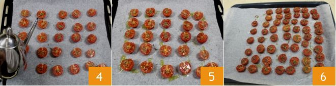 Verdeel de gedroogde oregano 10 en besprenkel ten slotte elk tomaatje met een beetje olie (4-5). Zet alles in een voorverwarmde oven op 140°C (boven- en onderwarmte) gedurende ongeveer 2 uur, totdat het vocht uit de tomaatjes verdampt is en ze licht geroosterd maar niet droog zijn geworden 6.