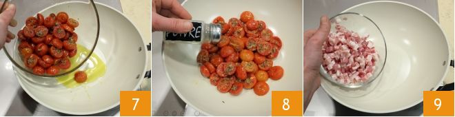 Als de tomaatjes klaar zijn, haal je ze uit de oven en doe je ze in een kommetje. Verhit vervolgens in een ruime koekenpan een scheutje olie en voeg de confit-tomaatjes toe 7, maal er peper over 8 en bak ze zachtjes op laag vuur terwijl je de pancetta klaarmaakt. Neem de blokjes gerookte pancetta die je voor het recept nodig hebt en doe ze in een andere pan 9.