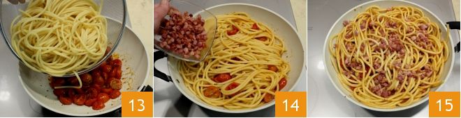 Als de bucatini al dente zijn, giet je ze af en doe je ze in de pan met de confit-tomaatjes. Bak ze kort op hoog vuur en voeg eventueel een scheutje kookvocht toe zodat de pasta niet te droog wordt. Schep alles om en voeg ook de pancetta toe 14, meng de bucatini nogmaals.