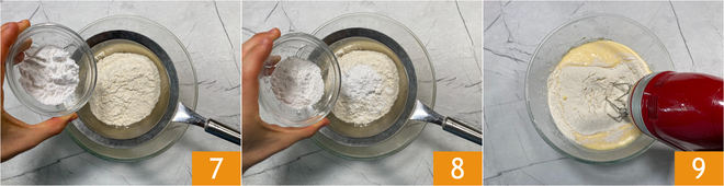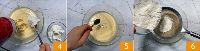 Op dit punt kun je de mascarpone lepel voor lepel toevoegen 4. Zet de mixer uit en voeg de vanille toe 5 en zeef de bloem erin 6,
