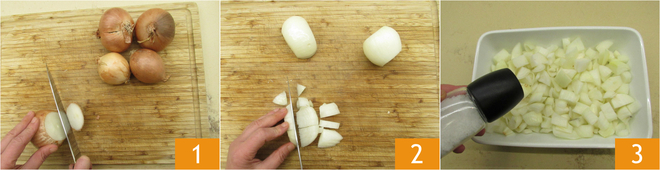 Om de uiencalzone te maken, maak je eerst de uien schoon 1 en was je ze meerdere keren om de scherpte te verwijderen. Snijd de uien grof 2. Doe de uien in een braadslee en breng op smaak met zout 3.