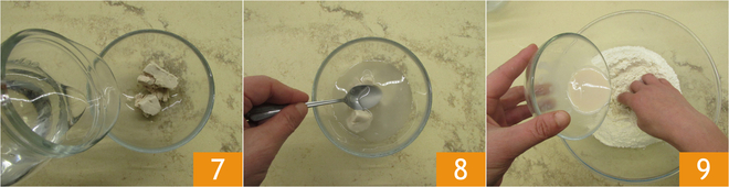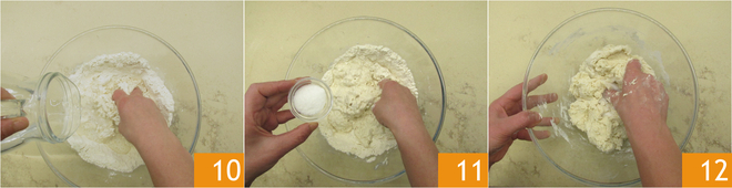 Giet ook het resterende water beetje bij beetje erbij terwijl je roert 10, voeg het zout toe 11. Kneed zodat het vocht wordt opgenomen 12.