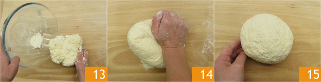 Stort het deeg op een bebloemd werkvlak 13, werk nog even verder met je handen 14 totdat je een gladde en egale consistentie hebt 15.