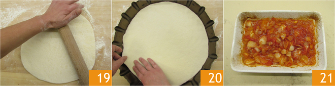 Je moet een deeglap krijgen die niet te dun is, minder dan een halve cm 19, met een diameter van 35 cm, overeenkomend met die van de bakvorm. Vet daarom de vorm met een diameter van 35 cm en een hoogte van 5,5 cm in en leg hier de deegschijf in 20. Ondertussen zullen de uien gaar zijn 21; laat ze tot lauwwarm afkoelen.