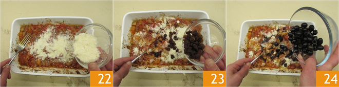 Voeg aan de uien de Pecorino toe 22, de rozijnen 23 en de olijven 24.