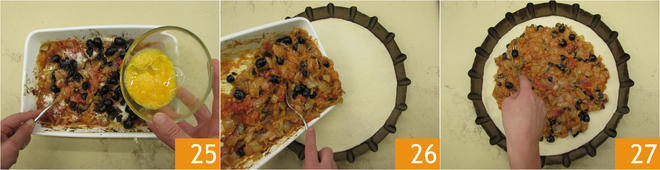 Voeg tot slot het ei toe 25, meng en schep de vulling in de bakvorm 26, waarbij je de buitenrand vrijlaat 27.