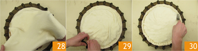 Rol de andere deegbol uit zodat deze iets dunner is dan de bodem en bekleed daarmee de bakvorm 28. Druk de randen samen om te sluiten, knijp vast en vouw om 29 en verzegel met de tanden van een vork 30.