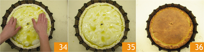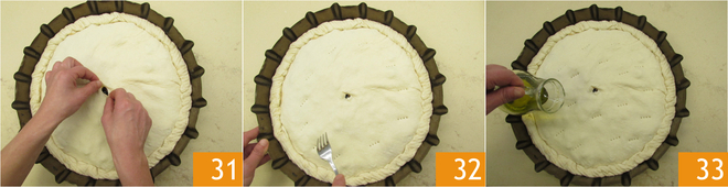 Prik in het midden een opening in het deeg 31, prik gaatjes in het oppervlak met een vork zodat de calzone tijdens het bakken niet opblaast 32 en giet de olie erop 33.