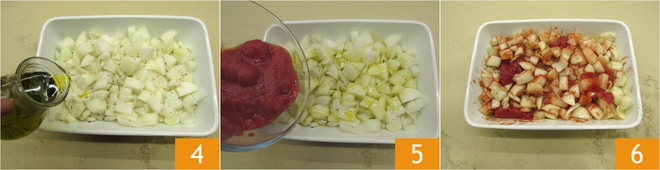 Voeg ook de olie toe 4, de peper en de gepelde tomaten 5. Meng 6 en bak in een voorverwarmde oven zonder hetelucht op 180C gedurende circa 50 minuten.