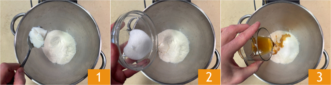 Om de cannolo millefeuille te maken begin je met het deeg: doe in een keukenmachine de bloem, het reuzel 1, de suiker 2 en de droge marsala 3.