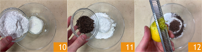 Bereid ondertussen de vulling: doe de ricotta in een kom en voeg de poedersuiker 10, de stukjes pure chocolade 11 en de geraspte citroenschil 12 toe.