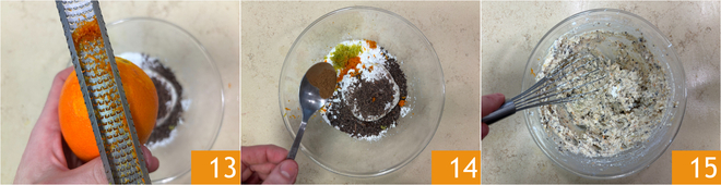 Voeg ook de sinaasappelschil 13 en de kaneel 14 toe en meng 15 goed totdat alles goed is opgenomen. Doe het mengsel in een spuitzak zonder spuitmond en zet even weg.